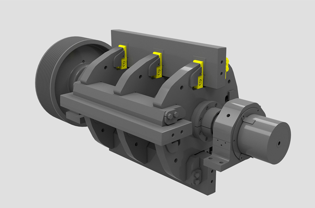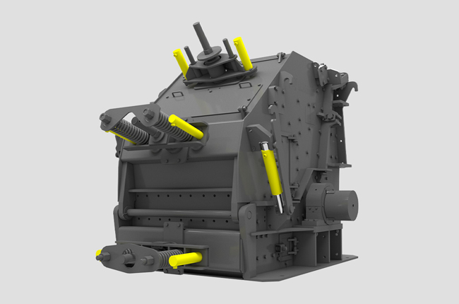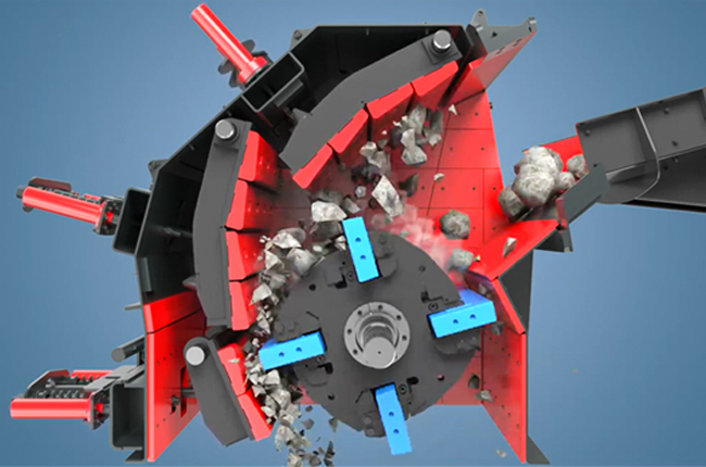反擊式破碎機(jī)是一種利用沖擊能來(lái)破碎物料的破碎機(jī)械。本機(jī)工作時(shí),在電動(dòng)機(jī)的帶動(dòng)下轉(zhuǎn)子高速旋轉(zhuǎn),物料進(jìn)入板錘作用區(qū)時(shí),與轉(zhuǎn)子上的板錘撞擊破碎,后又被拋向反擊裝置上再次破碎,然后又從反擊襯板上彈回到板錘作用區(qū)重新破碎,此過(guò)程重復(fù)進(jìn)行,物料由大到小進(jìn)入一、二、三反擊腔重復(fù)進(jìn)行破碎,直到物料被破碎至所需粒度,由出料口排出調(diào)整反擊架與轉(zhuǎn)子之間的間隙可達(dá)到改變物料出料粒度和物料形狀的目的。