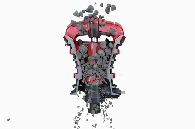 利用破碎錐在殼體錐腔內(nèi)的旋轉(zhuǎn)運(yùn)動(dòng)來(lái)擠壓、劈裂和彎曲物料,對(duì)各種硬度的礦石或巖石進(jìn)行粗碎。裝有破碎錐的主軸上端支撐在橫梁中部的襯套內(nèi),下端置于軸套的偏心孔內(nèi)。當(dāng)軸套旋轉(zhuǎn)時(shí),破碎錐繞機(jī)器中心線偏心運(yùn)動(dòng)。它的破碎動(dòng)作是連續(xù)的,所以它的工作效率比顎式破碎機(jī)高。