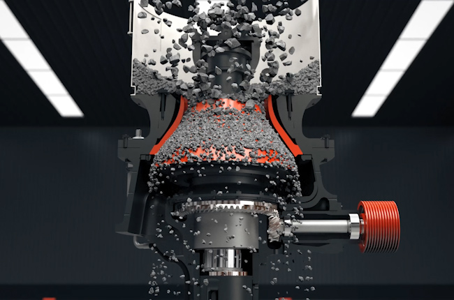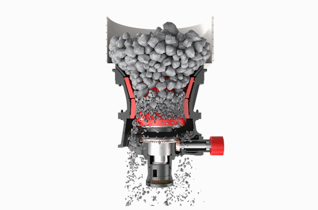 單缸圓錐破碎機(jī)工作時(shí),電機(jī)帶動(dòng)破碎機(jī)的小齒輪,小齒輪帶動(dòng)大齒輪,大齒輪組件帶動(dòng)偏心套組件和主軸組件以理論垂直線為中心,在銅襯套內(nèi)公轉(zhuǎn),主軸組件在偏心銅套內(nèi)以主軸的中心線可以實(shí)現(xiàn)自轉(zhuǎn)。當(dāng)物料加入到破碎腔后,主軸總成在物料的阻力下在偏心銅套內(nèi)緩慢的自轉(zhuǎn)。內(nèi)錐的運(yùn)行軌跡看起來是在破碎腔內(nèi)來回?cái)[動(dòng),同時(shí)緩慢的旋轉(zhuǎn)。物料被擺動(dòng)的內(nèi)錐擠壓破碎,破碎出的物料從而排料口排出。